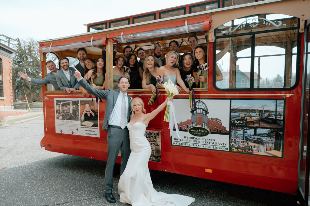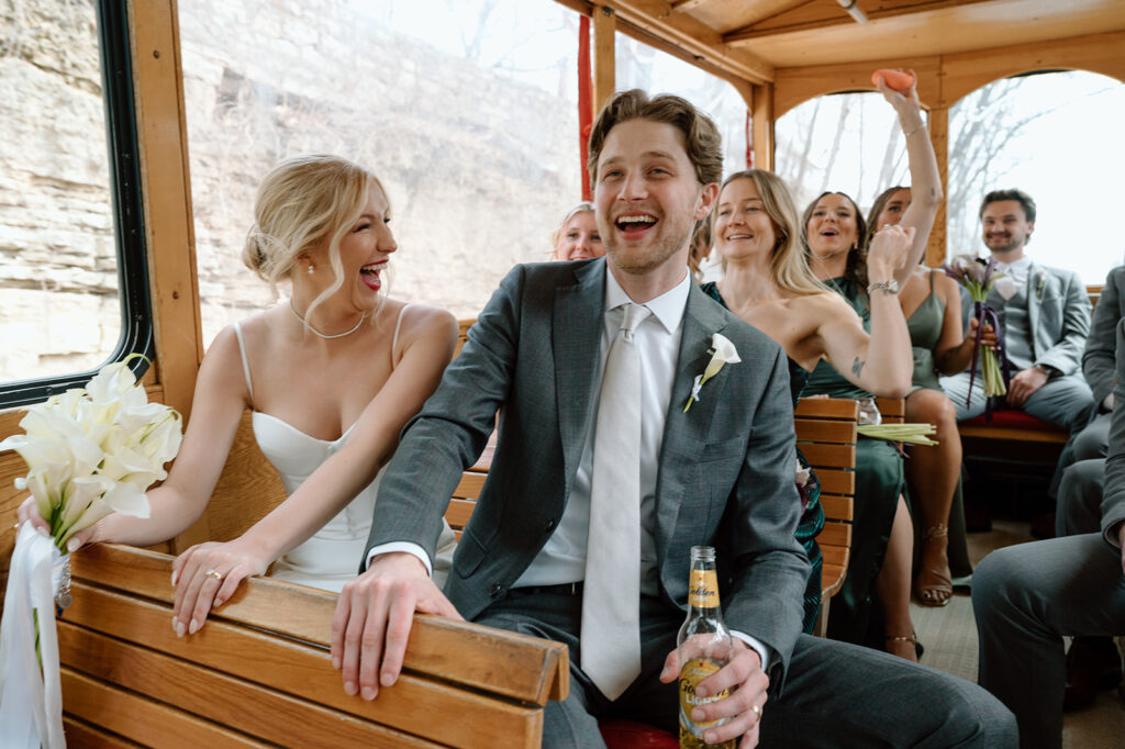 Harleigh + TJ went all out transporting their wedding party in style by renting a trolley for the day. It was a total vibe. Not only was it a super practical way to get everyone to the ceremony together, but it also made for the best photo ops. These are some of my favorite photos from the entire day! Plus it brought all the laughter, the champagne toasts, and the hype, it all started before the ceremony even began!